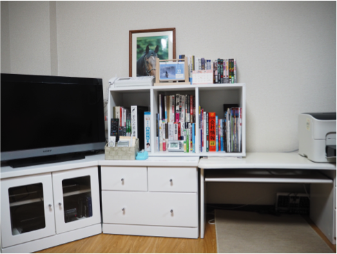 本棚がなかったTV台にカラーボックスで本棚を作り、本収納。本の整理と上部にや少し飾るスペースを設けました。