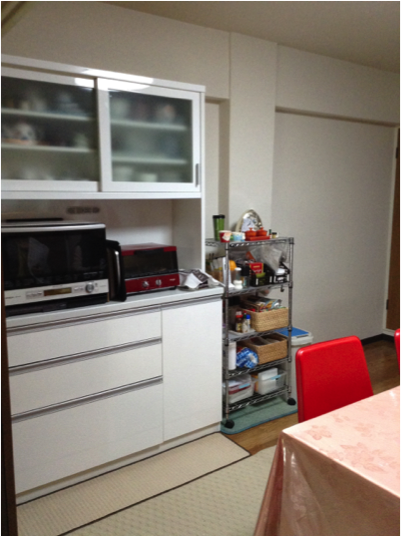 調味料が置かれていたカップボードのオープン部分に電化製品をまとめ、使い易くしまいた。また1年以上使っていないお皿は今回思い切って処分。日頃使っている食器のみ収納。